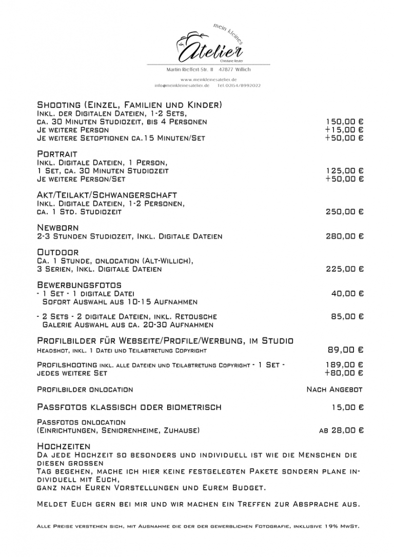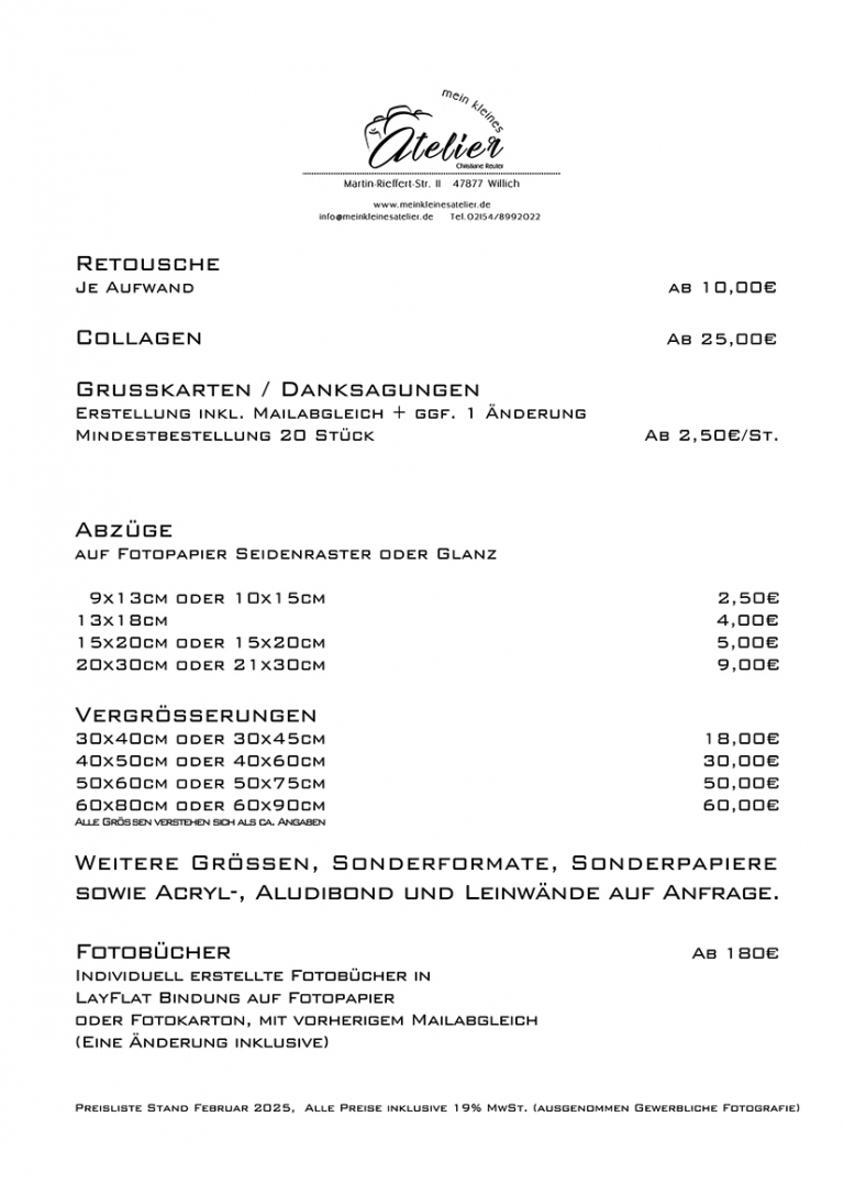 Der Fotograf weist darauf hin, dass der Auftraggeber möglicherweise für die gezahlte Vergütung Beiträge zur Künstlersozialversicherung abführen muss. Hierüber wird sich der Auftraggeber selbst kundig machen.
